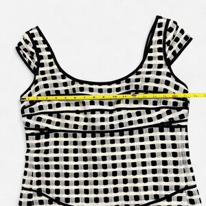 Narciso Rodriguez sleeveless checkered gingham style interwoven threading midi dress with scoop neck and exposed zip closure at back.