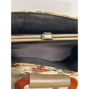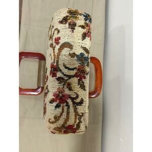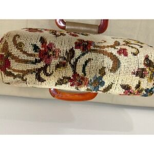 Vintage Tapestry Floral Handbag Amber Lucite Handle Kiss Lock Closure Women