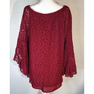 Forgotten Grace Burgundy Lace Off Shoulder Bell Sleeve Top Women's Size L
