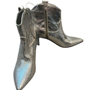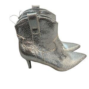 Guess Metallic Silver Snake Print Western Heeled Boots. NWOT. Size: 6M.