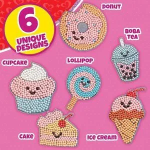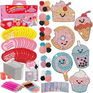 Includes 24 Individually Wrapped All-in-One Sweet Treat Rhinestone Paint By Numbers Kits for Boys and Girls to create their own diamond craft! Each set includes a Sweets template, matching diamond gems, a pen tool to apply the gems, a tray to hold the gems and wax to help the gems stick to the pen.