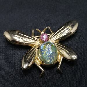 *Description: This is a beautiful Lucite winged insect brooch from the 1950s with a Lucite cabochon which has flakes of gold inside and a glass pink rhinestone head. The body changes its look as it moves in the light. This great vintage bug brooch would be a great addition to your vintage jewelry collection or make a great vintage gift!