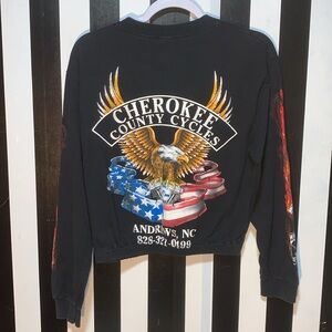 Andrews,NC Harley-Davidson/ motorcycle dealer logo / phone number on the back with eagle & motorcycle engine block , American flag banner