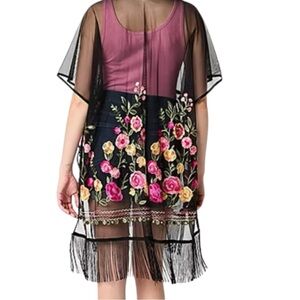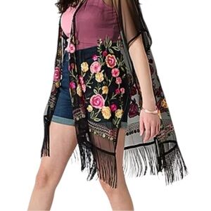Elegant black kimono with colorful floral embroidery. Features intricate fringe detailing.