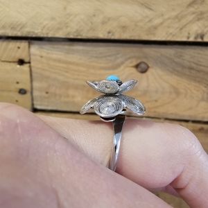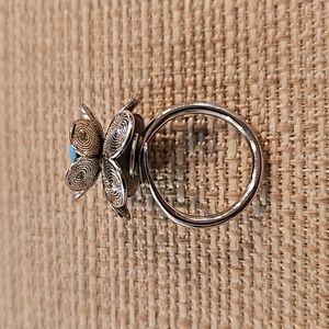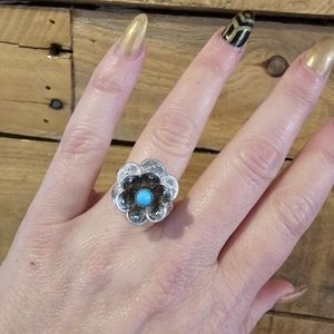 Vintage 1971 Sarah Coventry "Blue Buttercup" adjustable silvertone flower ring with faux turquoise center. Size 6.5 as it currently is but can be adjusted to smaller or larger size. Flower approximately 3/4" across. Stamped "Sarah Cov". Excellent vintage condition.