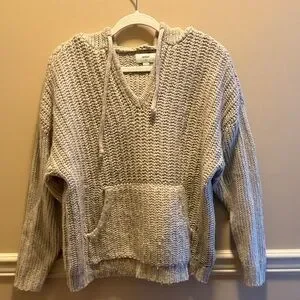 Cozy chunky knit hoodie sweater in a neutral tone. Features a front pocket and drawstring hood. Perfect for the cold winter months. Item listed in good condition due to some bally texture on the front but a fabric shaver would probably take care of them