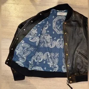 Leather bomber jacket with blue paisley print lining