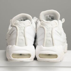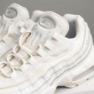 Nike Air Max 95 Essentials Triple White. Features a classic wavy design lines and visible Air cushioning in the heel and forefoot for comfort and support. The lace-up closure ensures a secure fit. Perfect for casual wear, athleisure looks, or running errands. These are a mens size 11 in great pre-owned condition with gentle wear.