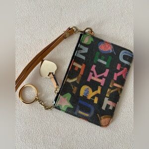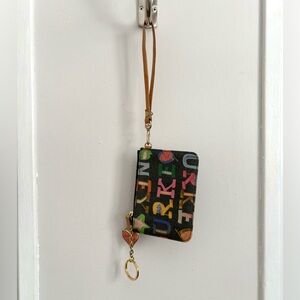 Fun, colorful Dooney & Bourke wristlet featuring the iconic multicolor logo print and signature heart charm. Compact but practical, with a wrist strap that makes it perfect for errands, travel, or nights when you just want the essentials.
