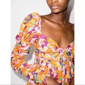 This Zimmermann sundress is a captivating choice for a wedding guest or cocktail event, featuring a ruched and ruffled design in vibrant orange and yellow hues. The dress boasts a sweetheart neckline and charming puff short sleeves, adding a touch of romance to its elegant silhouette.