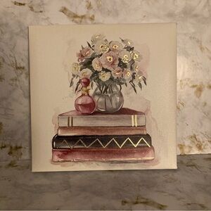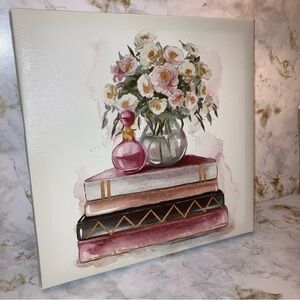 Charming canvas art featuring a floral arrangement and books. Includes pink and shiny gold foil accents. Perfect for home decor.