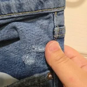 Condition: Pre-owned. Distressed throughout with frayed hems. Some staining on the front of legs — unclear if intentional distressing or wear (see photos). No holes beyond the designed distressing.