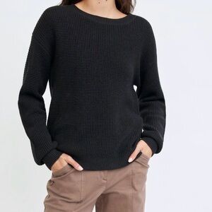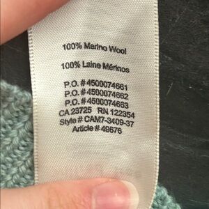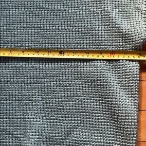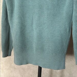 This is a crew-neck sweater with dropped shoulders and ribbed trim. It's waffle-knit with 100% Merino Wool - luxe, extra-fine yarn beloved for its natural warmth and soft, lightweight feel. Beautiful soft aquamarine color and tag attached. Pictures with model included for styling!