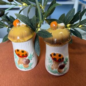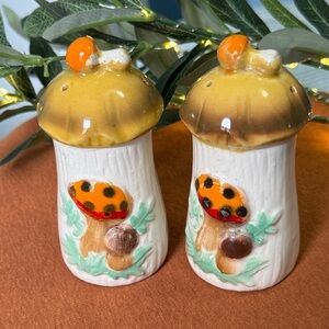 Vintage Merry Mushrooms Salt and Pepper!Shakers .(4" tall ) From the 70's..by Sears Cottage Core. ..mushroom-themed ..features vibrant orange and brown accents..a charming addition to any kitchen decor. With a whimsical 1970's style and design. Perfect for those with cottage core aesthetics and collectors..Great Vintage Condition.