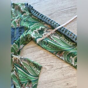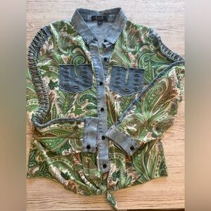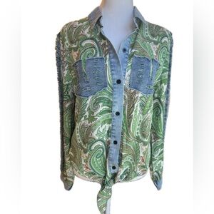 A.Z.I. New York Paisley Print Denim & Chiffon Open Lattice Long Sleeve button Down tie knot bottom S Questions? Leave a comment below!