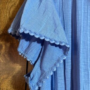 Chic blue blouse with V-neck design. Features delicate lace detailing. Short sleeves for a breezy feel.