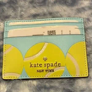 Kate Spade Grand Slam Tennis Small Slim Card Holder. It is part of the "Grand Slam" collection, featuring a blue and yellow tennis ball design.