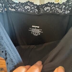 SKIMS Fits Everybody lace long slip dress in the color Onyx. Features the signature ultra-stretch, smoothing fabric with delicate lace trim at the neckline and adjustable spaghetti straps for a sleek, body-skimming silhouette. Can be worn as a slip, lounge piece, or styled as a minimalist dress. Pre-loved and in excellent condition. Worn maybe twice. No flaws noted. Size Medium. Color Onyx / black. Brand SKIMS. Made in Vietnam.