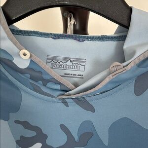 Patagonia blue camouflage pullover with hood and thumb holes shirt