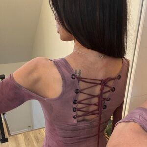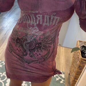 Chic open shoulder long sleeve mini dress/shirt with studded details. Features a unique graphic design. Ideal for a fun night out. Color is a pinkish mauve- has beautiful sparkly rhinestones on the front of the dress. Two circle accents are missing as shown in the photos, two small holes in the front, but not noticeable when wearing. I’m not sure if there is a part of the dress towards the bottom that is a bleach mark, or if it was always like that, but that is also not noticeable when wearing. Back has strings to make the dress tighter or more loose at the top like a corset. This dress is very delicate- never ever place this dress in the washer, or dryer. This dress can ONLY be hand washed with a very delicate hand and air dried. The one time I got it dry cleaned was when the two circles fell out, so I wouldn’t even get this dress dry cleaned. Price reflects the imperfections. Was originally $275.00 purchased in Miami 💗 I’ve also worn this with leggings and worn it as a top. I like to tie the one side to give it an asymmetrical look.