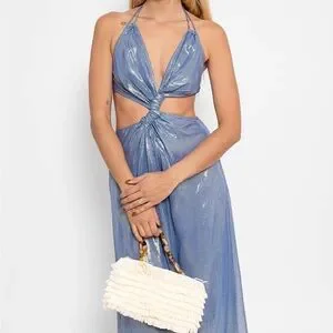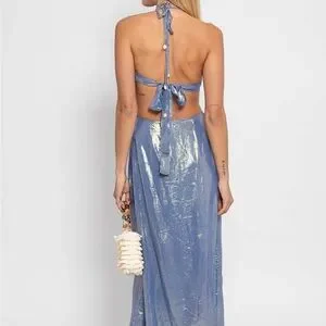 This stunning blue halter dress features a shimmering finish and a stylish cut-out design. Perfect for any special occasion.
