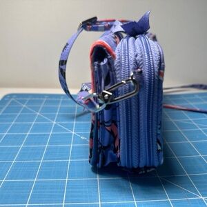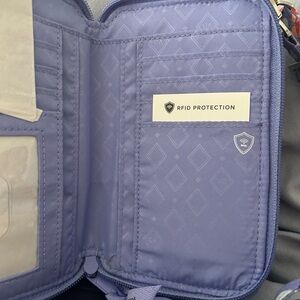 Charming quilted wallet with vibrant floral pattern. Includes matching detachable strap and RFID features. Many compartments and comfortable design