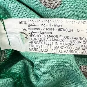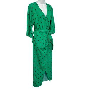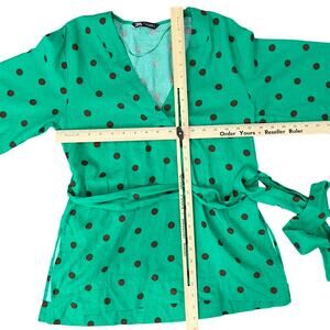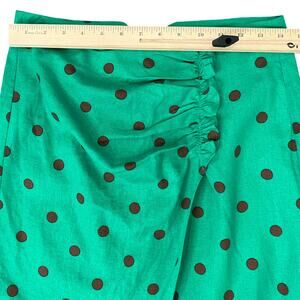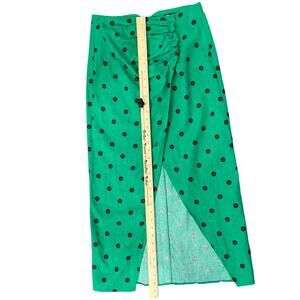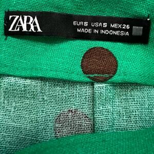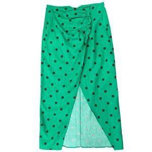 Trendy two-piece linen-blend set from Zara featuring a green and brown polka dot print. The kimono-style half-sleeve top pairs with a high-waisted midi skirt featuring a ruffled front, gathered detailing, and a front slit at the hem. Includes a removable sash tie and invisible back zip. Made from a 50% linen, 50% viscose blend — lightweight and breathable. A true blogger favorite!