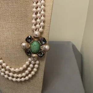 This is a three-strand pearl necklace with a vintage-style, green cabochon, pearl and black diamond stone. Pre-owned and good condition.
