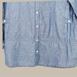 Chico’s chambray-style long sleeve shirt jacket in a breathable linen-cotton blend. Features a button front, chest flap pockets, shoulder epaulets, and tab sleeves. The back has subtle gathering hem for light shape and movement.