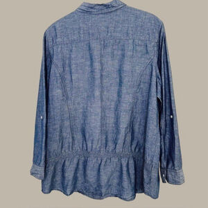 Chico’s Size 3 (XL / 16–18) Blue Chambray Shirt Jacket Linen Blend Peplum Utility Coastal