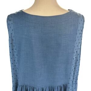 Details: Sleeveless Blue Dress with Embroidered Floral and Vine Panel Details. Round Collar, Gathered at Higth Waist Jumper Style Midi