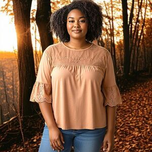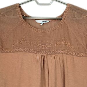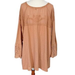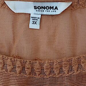 Sonoma Mesh Embroidered Top 3X Eyelet Camel Color Jersey Knit Boho Chic Western. Condition is pre-owned with no rips, tears, holes or discolorations. Mesh neck detail with embroidery. Eyelet balloon sleeves. Jersey knit. PLEASE SEE MEASUREMENTS!!