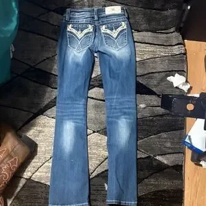 Stylish flare jeans by Miss Me. Classic blue with a flattering fit. Perfect for casual outings.