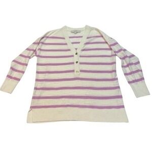 Stylish and comfortable, this small LOFT sweater top features a classic striped pattern in cream and purple. The V-neck design is accented with three gold-tone buttons, adding a touch of elegance. With long sleeves and a relaxed fit, it's perfect for layering or wearing on its own. Side slits at the hem provide ease of movement and a modern touch. Ideal for casual outings, weekend brunches, or cozy evenings at home.