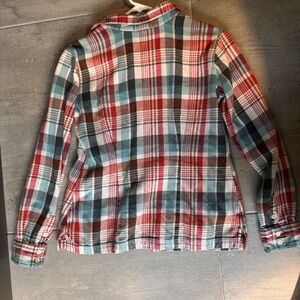 Casual button-down shirt with vibrant plaid design. Features red, blue, and white tones. Ideal for everyday wear.