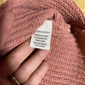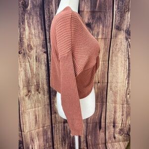 Jessica Simpson mauve pink cropped top V-neck sweater. 100% polyester, machine washable. This sweater is previously owned, worn condition. There is a flaw in stitching and a hole in shoulder seam, see photo and video. Still such a cute sweater! Please examine all photos carefully and refer back to them for approximate measurements and condition. Thanks for looking 😊😊