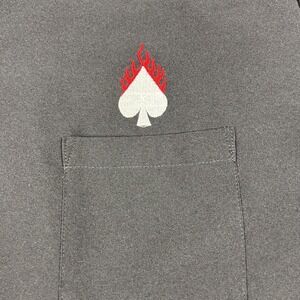 Color: Black with white and red flaming playing card suit graphics on the chest and across the back yoke.
