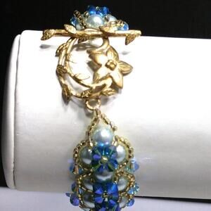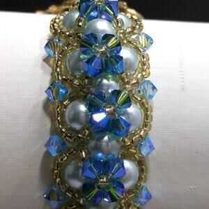 This is a beautiful hand-crafted bracelet with blue aurora borealis crystal beads and light blue faux pearl beads and very slight gold seed beads. The clasp is a decorative gold tone toggle clasp and is stamped on the inside but I can not read it. The bracelet is 7 inches in length and 7/8 Inch wide. Pre-loved. Beautiful.