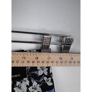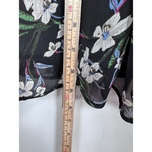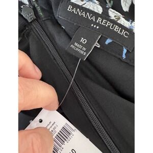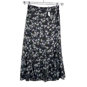 Banana Republic black floral maxi skirt size 10. This elegant skirt features a delicate white and blue floral print with green leaves and pops of pink on a sheer overlay. Its flowy silhouette and maxi length create a graceful and feminine look, perfect for a garden party, a beach vacation, or a casual brunch.