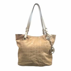 MICHAEL KORS NEW JET SET CROC LEATHER TOTE. TAN LEATHER. TOP SNAP CLOSURE. DOUBLE TOP HANDLES. GOLD TONE ACCENTS AND HARDWARE. ADJUSTABLE STRAPS. HEIGHT: 10.5" X LENGTH: 12" X WIDTH: 6.5". HANDLE DROP: 10.5". CANVAS PRINT INTERIOR. INTERIOR POCKETS. COMES WITH THE DUSTER. NEW WITH TAGS. $248 RETAIL.