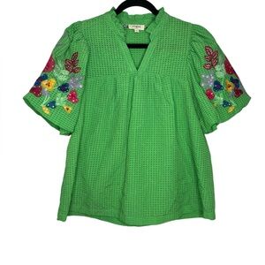 Umgee Seersucker Embroidered Floral Sleeve Green Blouse Size Small