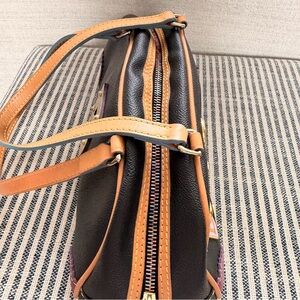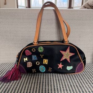 Dooney & Bourke Lindsay Lohan Y2K Charm Bag, #5. Rare, vintage bag collab by Lindsay Lohan to promote mean girls back in 2004. Double handle black leather with tan trim. Rainbow, zipper, pink and purple leather tassels. All over 3-D charms. Good used condition, especially considering it is over 20 years old! Light signs of wear on interior and some scratching on the number five. Please see pictures. Priced accordingly.