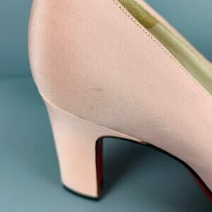 CHRISTIAN LOUBOUTIN pumps in a pink fabric featuring iconic red sole, and black bow detail. Comes with dust bag. Made in Italy.