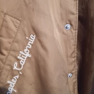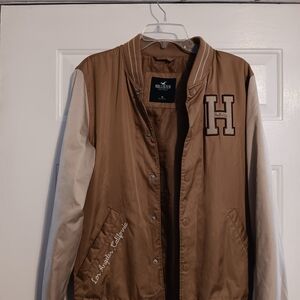 Classic Hollister letterman jacket. Tan body with cream sleeves. Iconic 'H' logo on chest.