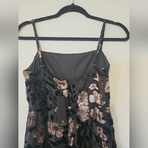 This stunning black floral maxi dress is perfect for any special occasion. The elegant design features a beautiful floral pattern black velvet burnout. fully lined. very good condition. lulus tag still attached sexy slit left side. size Small measurements approximate flat. pit to pit 16" waist 13" length 54" please see photo of Lulus size chart