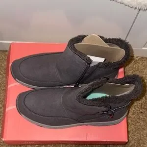Easy Spirit Tyme2 ankle boots in taupe, featuring water-repellent material, comfort cushioning, and an ultra-flexible sole