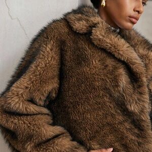 chocolate brown faux fur jacket, brown teddy coat, vintage style jacket, mid length winter coat, faux fur coat women, plush brown jacket, cozy winter outerwear, statement coat, cold weather jacket, fall winter coat, neutral brown jacket, chic layering piece, street style coat, classic winter jacket, elevated casual outerwear, soft faux fur texture, trendy winter fashion, womens jackets and coats vintage fur trimmed fur trim style zara style luxury teddy