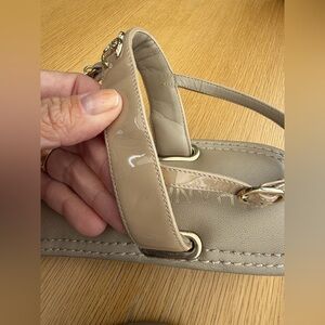 This stylish pair of sandals have beige quilted calfskin leather insoles, and feature adjustable beige leather ankle straps with a leather-threaded, polished gold chain detail at the thong and quilted about 1.5 inch heels
