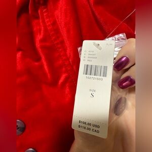 I bought this needing for a skirt it looked more tomato red online and its more of a true deeper red. Never worn.