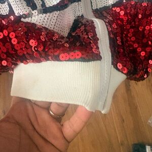 Shine bright with this stunning red sequin bomber jacket. Perfect for adding a touch of glamour to any outfit.